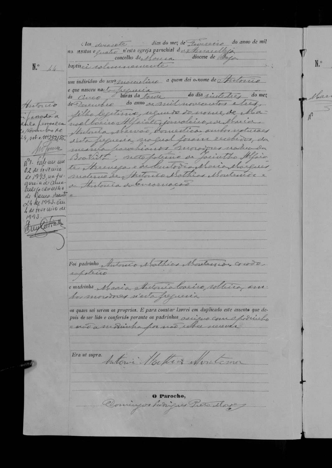 O Arquivo Distrital de Beja destaca o documento relativo ao assento de batismo de António Alfaiate Marvão que se realizou a 17 de fevereiro de 1904 na Igreja Paroquial de Amareleja.