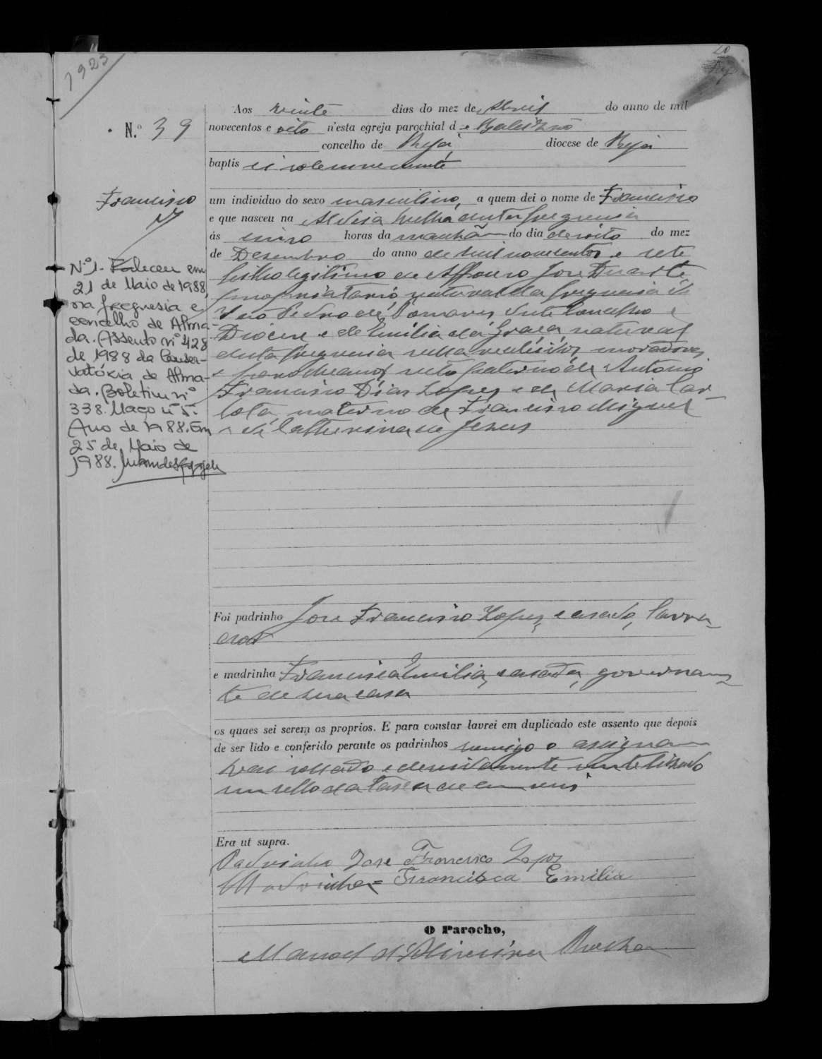 O Arquivo Distrital de Beja destaca o assento de batismo de Francisco Miguel Duarte que teve lugar no dia 20 de abril de 1908, na Paróquia de Baleizão.