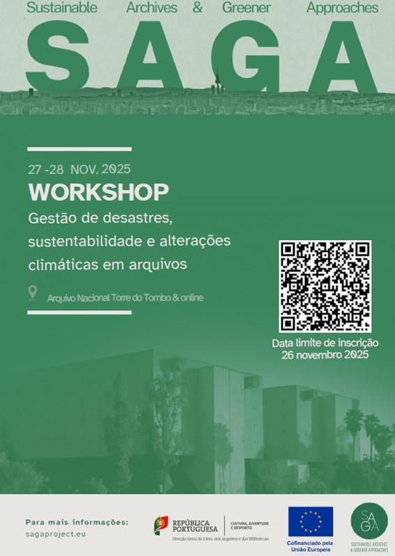 Já estão abertas as inscrições para esta iniciativa do Projeto Sustainable Archives and Greener Approaches (SAGA), cujo propósito é discutir e partilhar estratégias, práticas sustentáveis e soluções colaborativas para proteger o património documental face às mudanças climáticas e aos riscos crescentes. São também objetivos deste encontro identificar fatores de risco e explorar práticas sustentáveis na gestão de documentos e arquivos, promovendo a partilha de conhecimento e experiências entre profissionais da área.