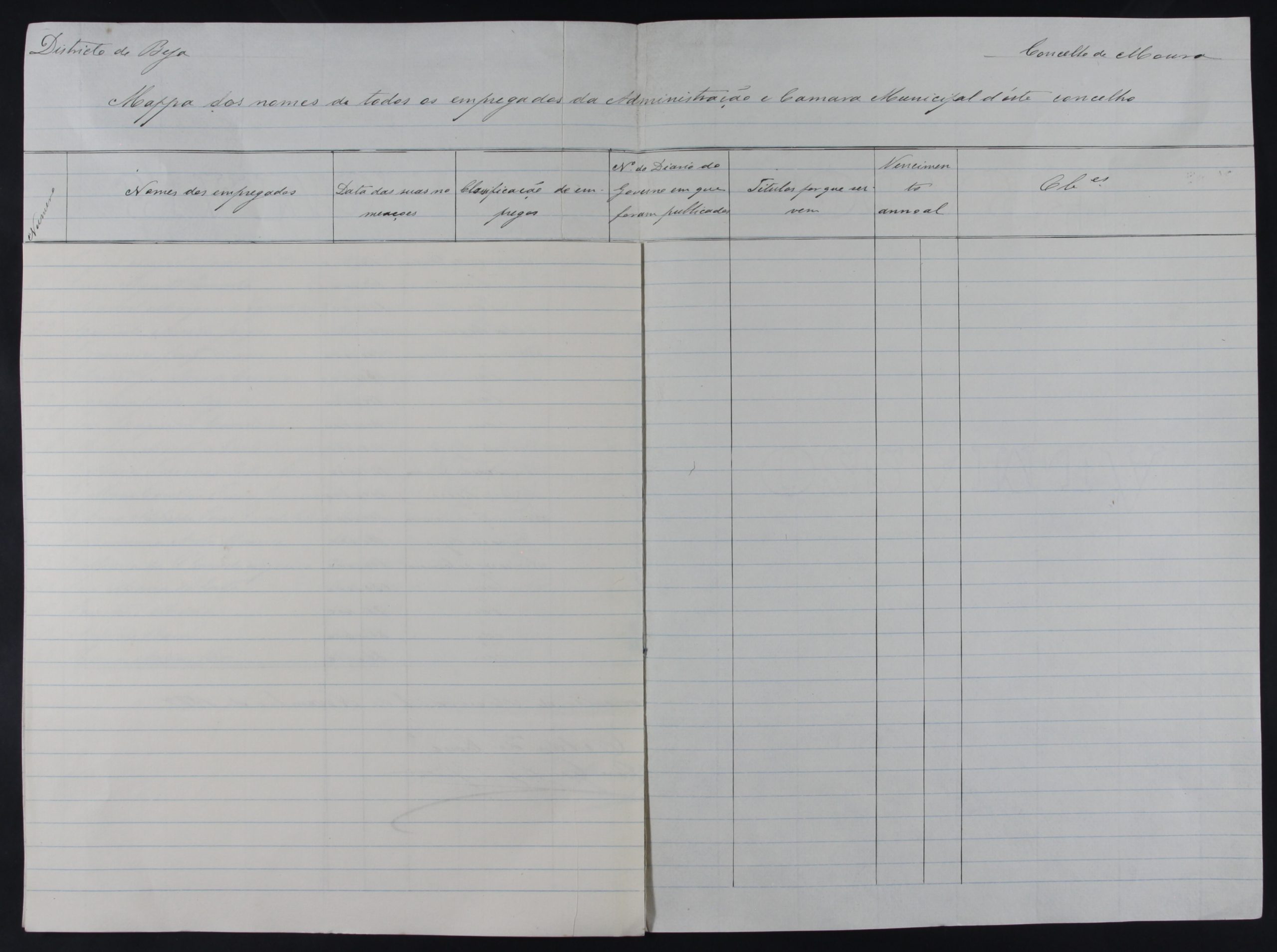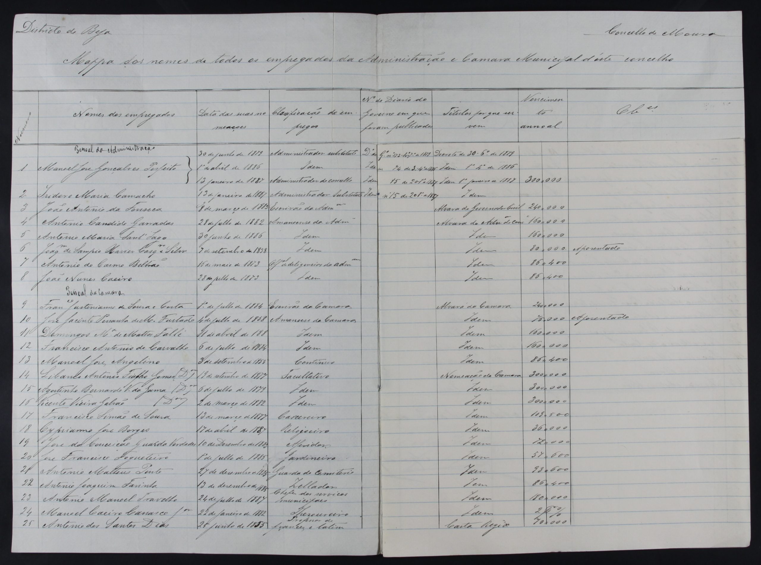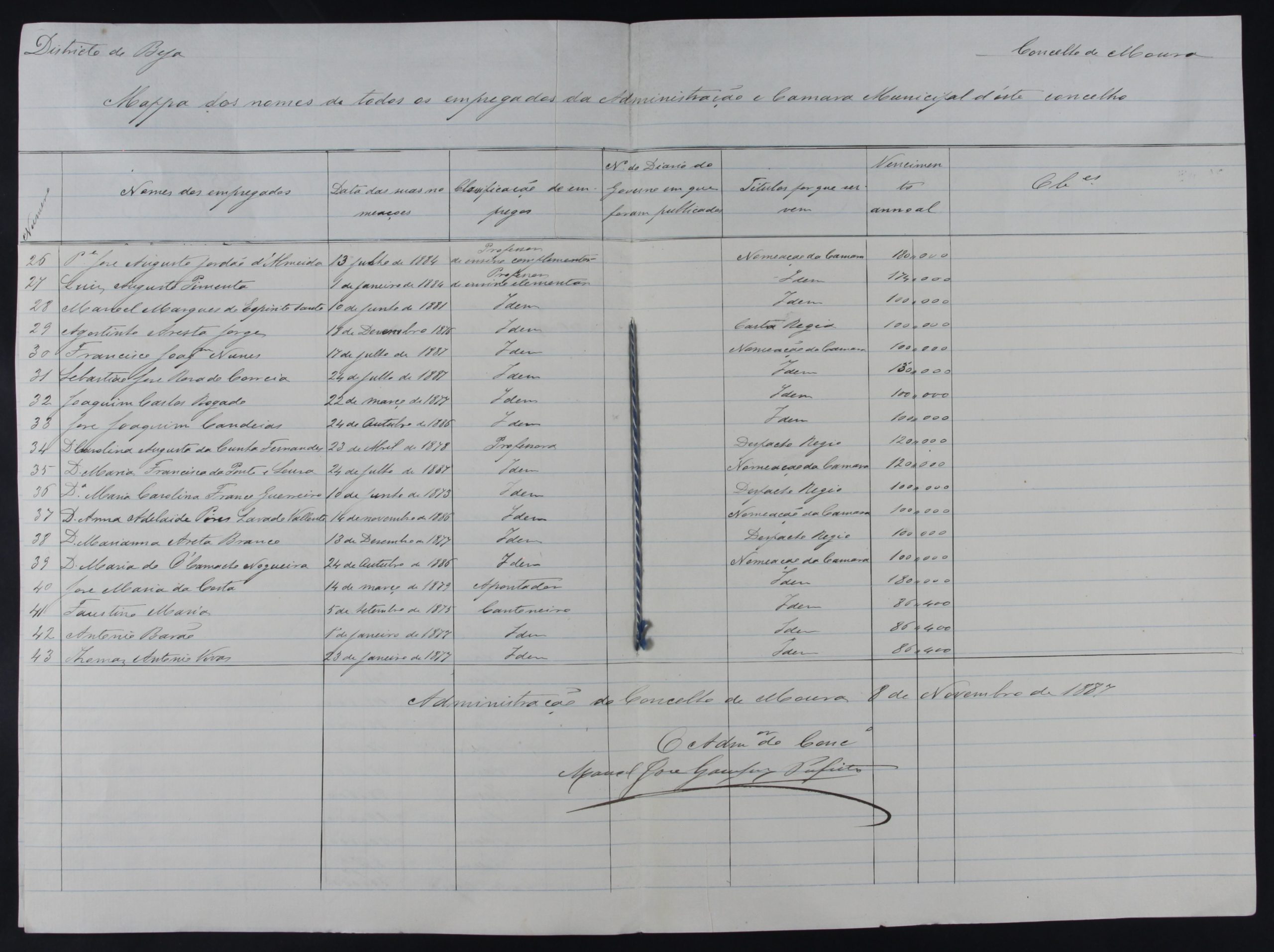 Relação dos nomes de todos os empregados da Administração e Câmara Municipal do Concelho de Moura no ano de 1887